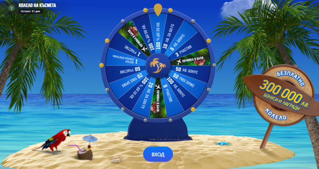 8.1 По време на допълнителна бонус игра „Безплатно Колело на Късмета над 300 000 лв. бонуси и награди“ ще бъдат раздадени три 3 бр. предметни награди – почивка в Бали.